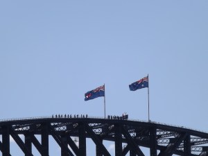 People climb the bridge from early morning until late at night. The people by the flags on the photo to the left are bridge climbers who pay about $250 for the privilege.
