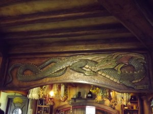The journey took us to the Mill and then over a double arched bridge as we arrived at the Green Dragon Inn where we enjoyed a cup of ale and stout. We sat at a table with some of our fellow travelers and enjoyed the warmth of a crackling fire and the figure of the green dragon over the impressive bar.