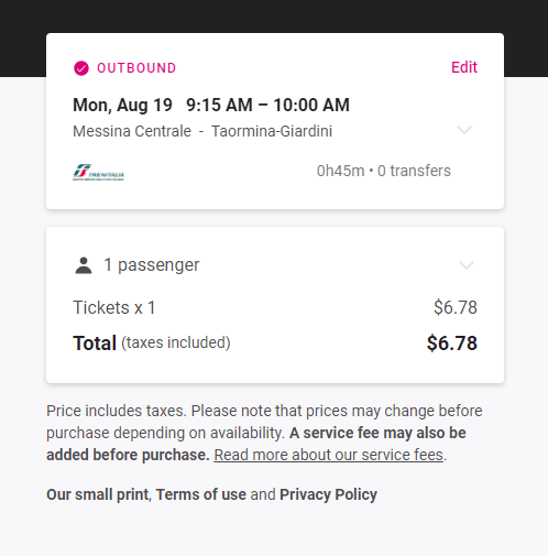 Trip to Taormina by train, 45 minutes. Train station is a ten minute walk from port.