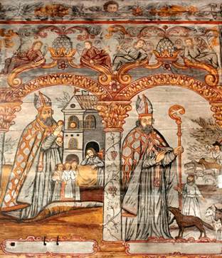 Seven legends of St. Nicholas are depicted in the church. One of the polychromes shows the saint giving three young maidens balls of gold. A poor maiden without a dowry had no chance of marriage. St. Nicholas is shown saving the future of these young women.