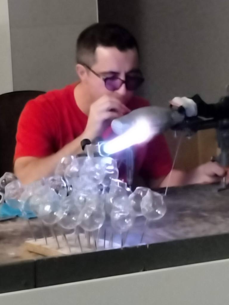 Off to the side are the glass blowers, carefully shaping the baubles.